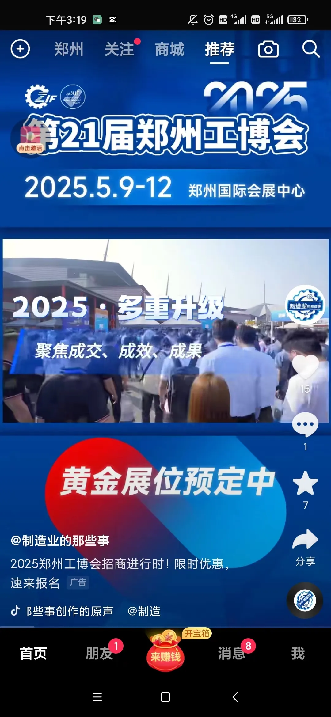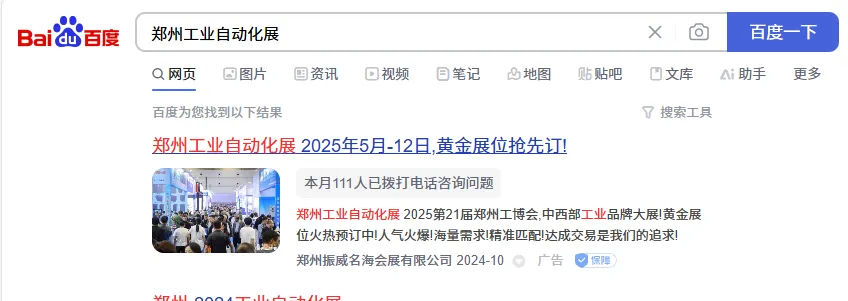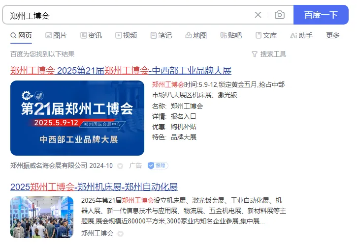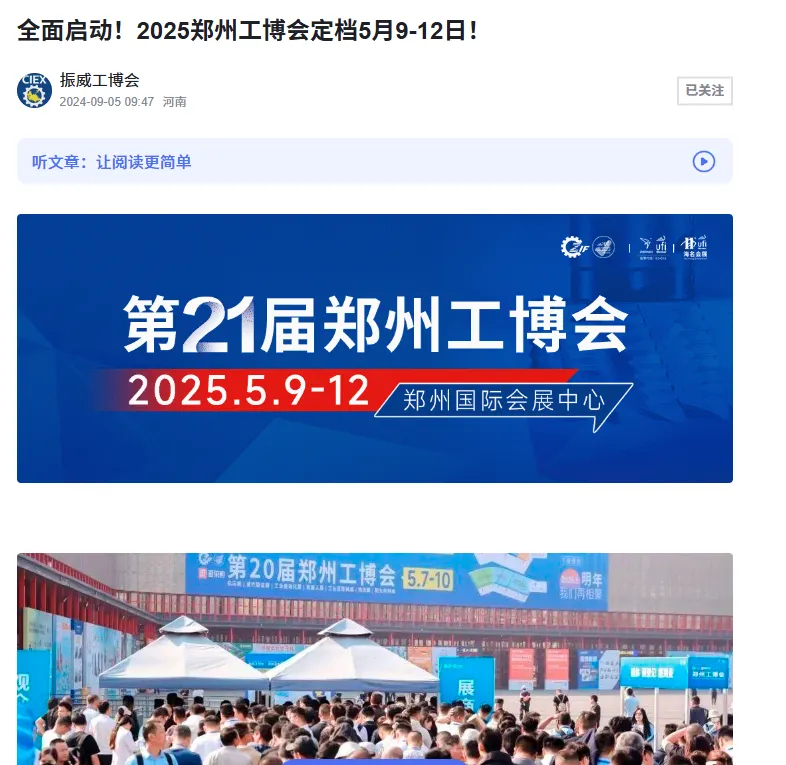 【2025郑州工博会】百度、抖音、头条、媒体广告已就位,新一轮宣传攻势火热开启!发表时间:2024-10-30 08:43 2025第21届郑州工业装备博览会 第21届郑州工博会将于2025年5月9-12日郑州国际会展中心举办!展示面积80,000平方米,12大展馆满馆呈现,届时将邀请来自国内外3000余家知名品牌企业、龙头企业、行业翘楚,全面展示新质生产力下的最新技术与成果,预计将吸引90000余名专业观众! 目前,2025郑州工博会招商工作如火如荼,展会招商已超预期,黄金展位即将售罄,呈现火爆态势!展会宣传及观众推广工作也同步启动!展会宣传营销体系全面铺开,着力构建线上线下传播矩阵,力度更大、范围更广、措施更实、精准度更高,不断夯实展会实效性,切实保障参展商的利益与展会效果,吸引优质买家到场参观。 线上广告 百度 抖音/头条 行业媒体 自媒体 线下用户行业展会&同行展会 涉及汽车及零部件、矿山机械、造纸机械、食品加工机械、环保机械等领域。 洛阳展会 粮油机械展 数字化智能化工厂技术行业交流会 砂石设备展 食品及机械展 线下线上全面推进,精准覆盖行业人群,锁定优质买家,直达细分市场,持续为展会发力! 2025年5月9-12日郑州工博会 郑州国际会展中心举办 展位招商火热进行中! |